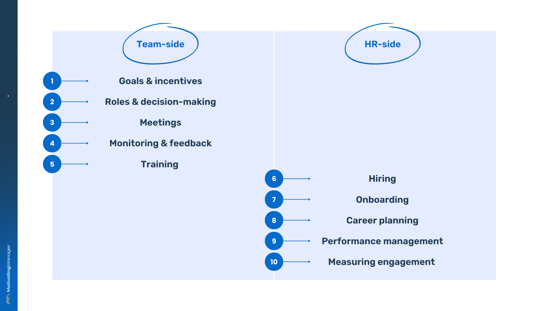 If you’re lucky enough to have a strong HR team supporting you, they’ll mostly take care of introducing and fine-tuning the “HR-side” processes in the list above as part of their accountability for these at the company level. But if any of these HR processes are not in place or not functioning as well as they could, it’s in your best interest as a manager to proactively partner with HR to implement or improve them as soon as possible.