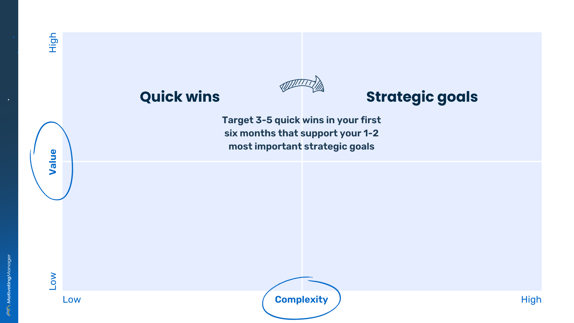 As a new leader, your best chance to demonstrate competence is to start with these high-value, low-complexity quick wins in the top left-hand corner of the matrix.