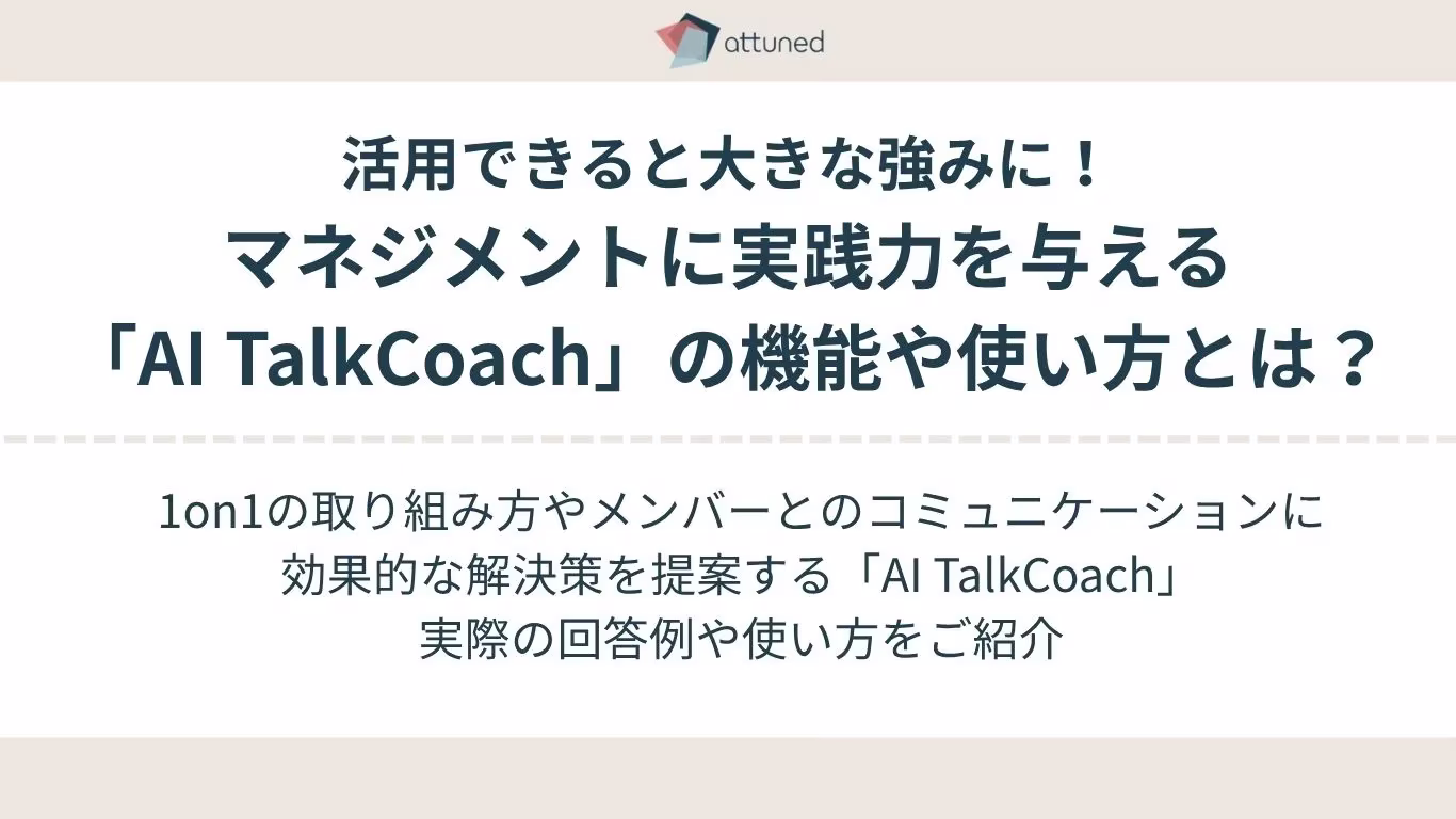 マネジメントに実行力を与えるAttuned新機能「AI TalkCoach」についてご紹介します。人それぞれに合わせたコミュニケーションのサポートをしていきます。