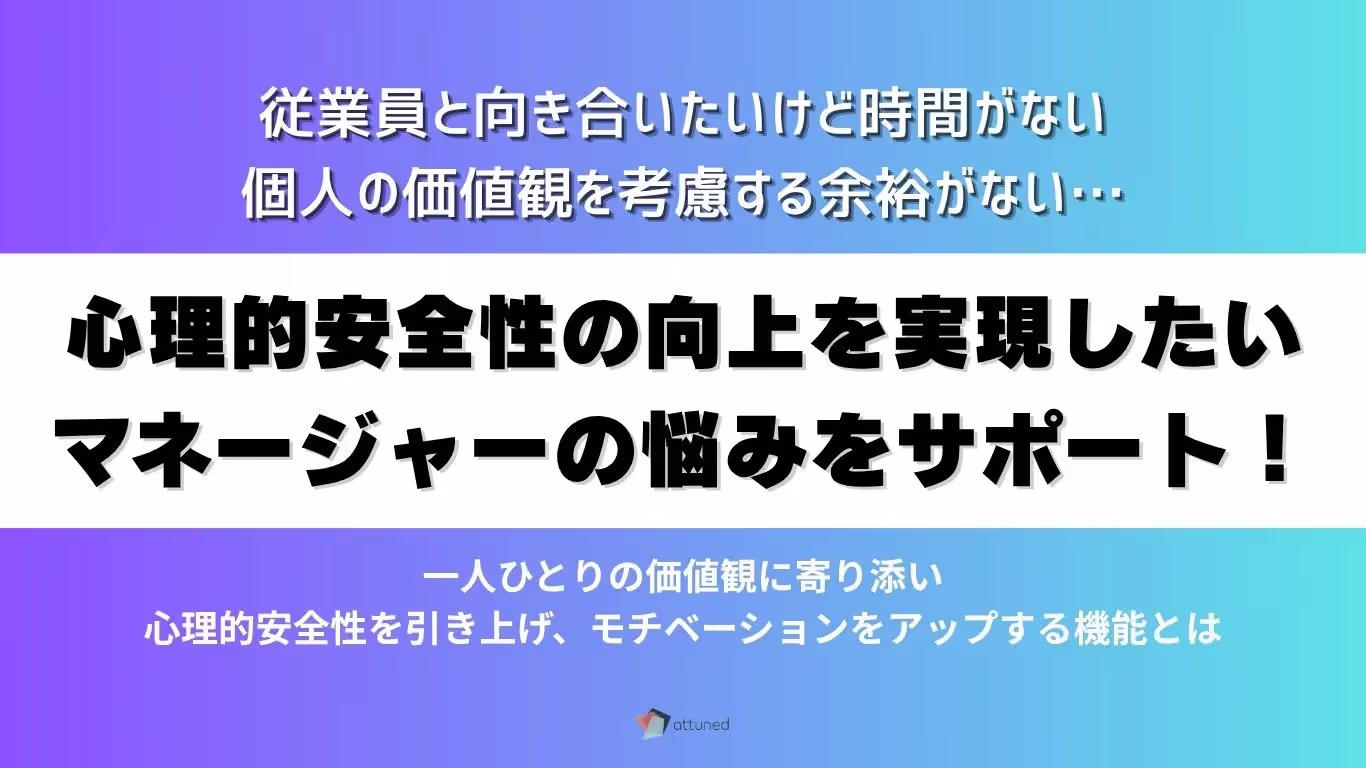 心理的安全性は、モチベーションを支える土台となります。 しかし、具体的にどのような方法で心理的安全性が高まるのかを考えることは難しい場面も少なくありません。なぜなら、メンバーの個人差や価値観を考慮し、適切な手段を見つけるまでに多くの時間を要するからです。 本稿は、Attunedのモチベーションインサイトが、心理的安全性の高い職場づくりにどう貢献可能であるかを解説します。