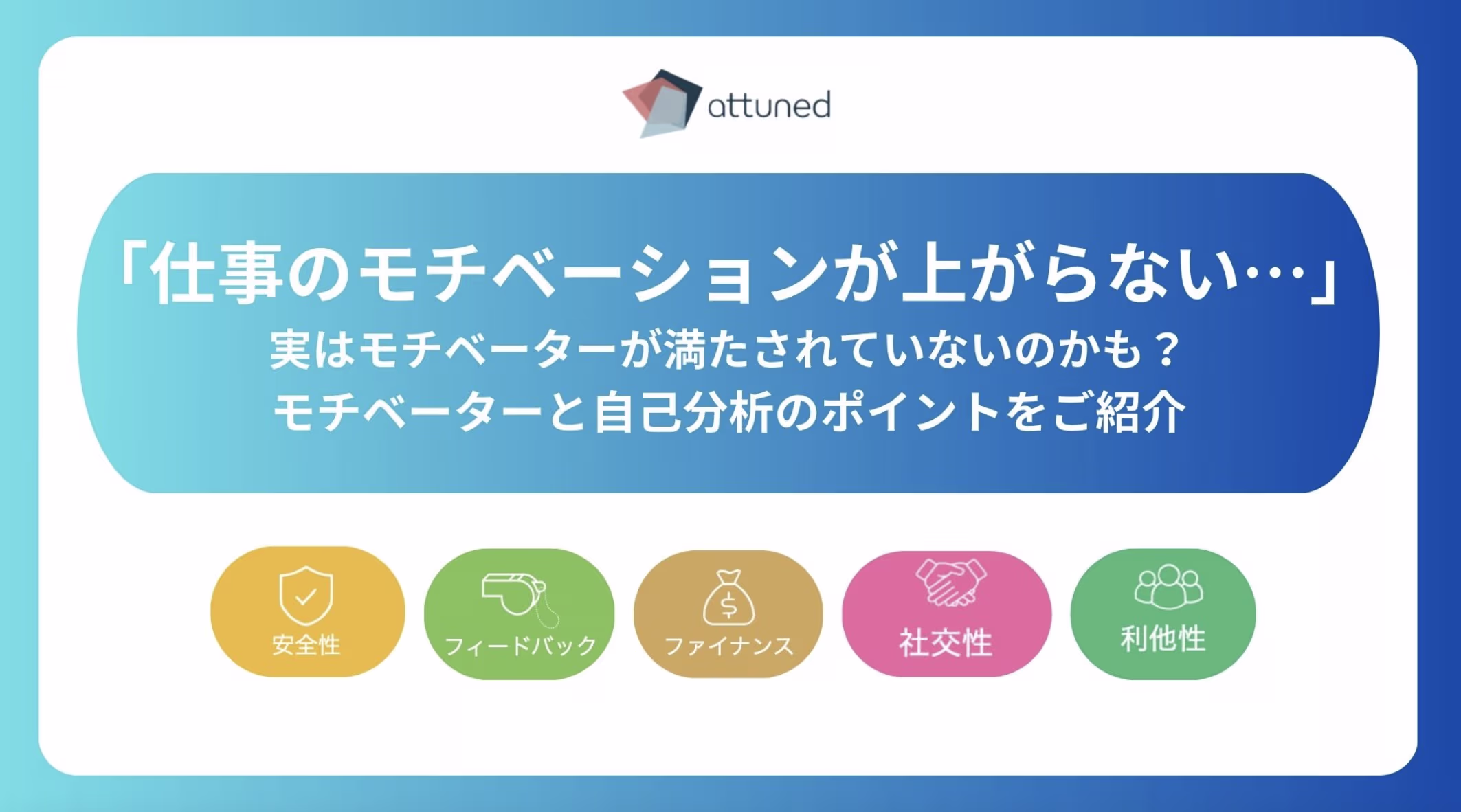 Attunedは、心理学に基づいた個人モチベーションの可視化をベースとしたエンゲージメントサービスです。やりがい創出、生産性向上、離職防止、心理的安全性の向上、人材育成・マネージャー育成などに効果的なソリューションを提案しています。