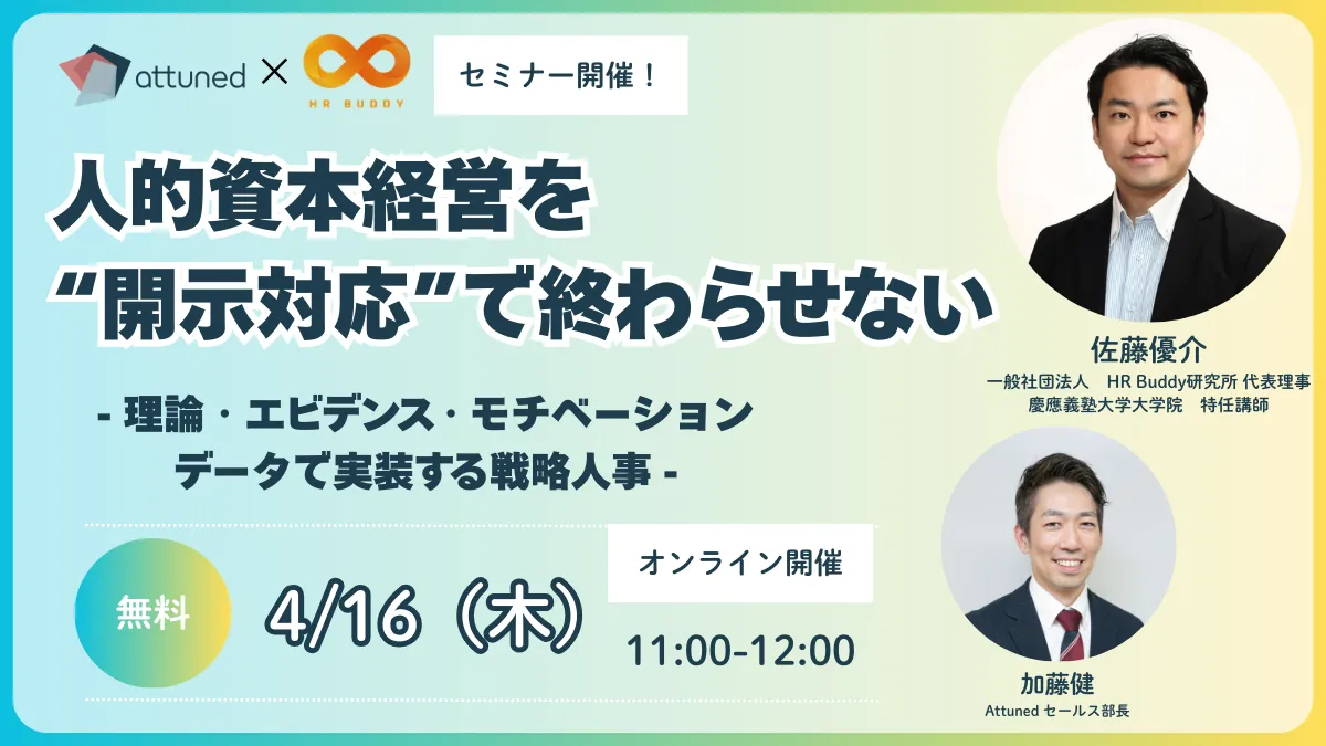 「部下と本音で話せている感覚がない」 世代や働き方が多様化する中、社員同士のコミュニケーションについての悩みが多く寄せられます。こうした声に対し、Attunedはモチベーションの見える化を通して、社内におけるコミュニケーション/人間関係の改善をサポートしています。 本セミナーでは、Attunedのエキスパートが製品の考え方・特徴を余すことなくご紹介するので、他サービスとの違いを実際の画面を見ながら...