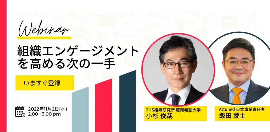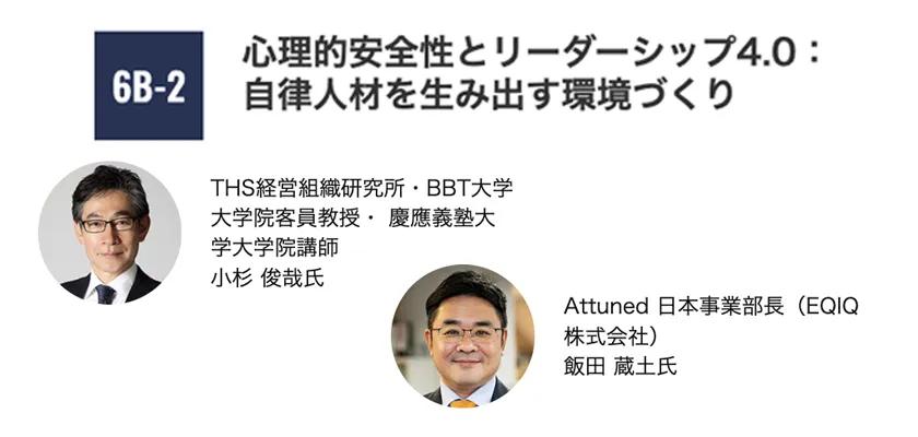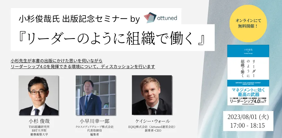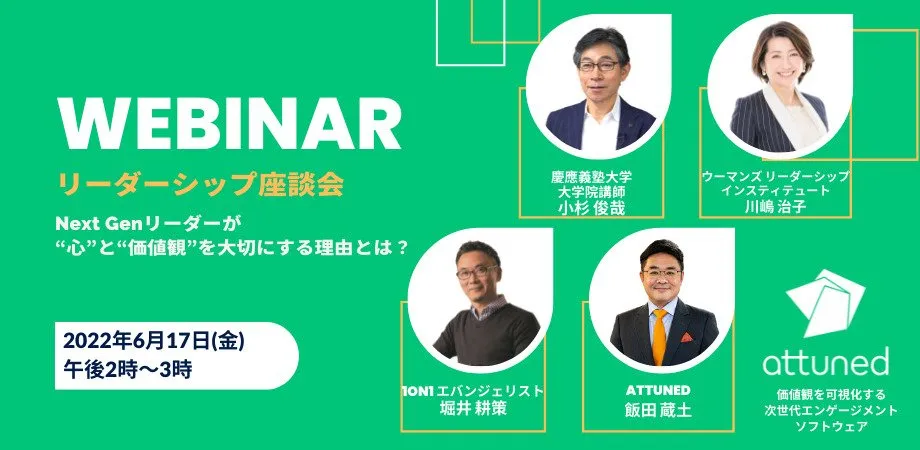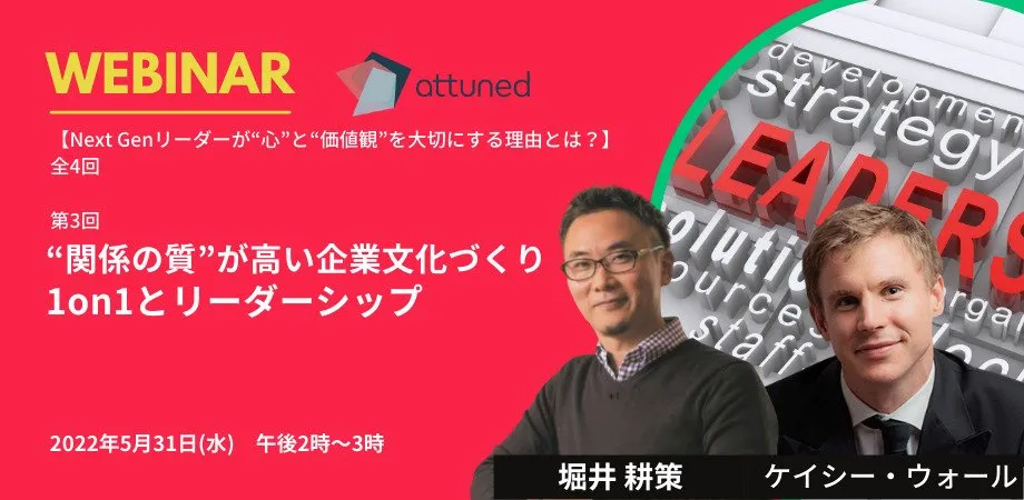 大学や企業でのリーダーシップ教育に携わる小杉俊哉 氏、オーセンティックリーダーシップを企業CxOに伝える川嶋治子 氏、1on1ミーティングを通じた人材育成に携わる堀井 耕策 氏をお迎えし、内発的動機の可視化ソフトウェア・サービス Attuned 日本事業部長 飯田 蔵土 がモデレーターとなり、それぞれの立場から、次世代のリーダーシップ人材の育成に必要な観点をお伺いしていきます。...
