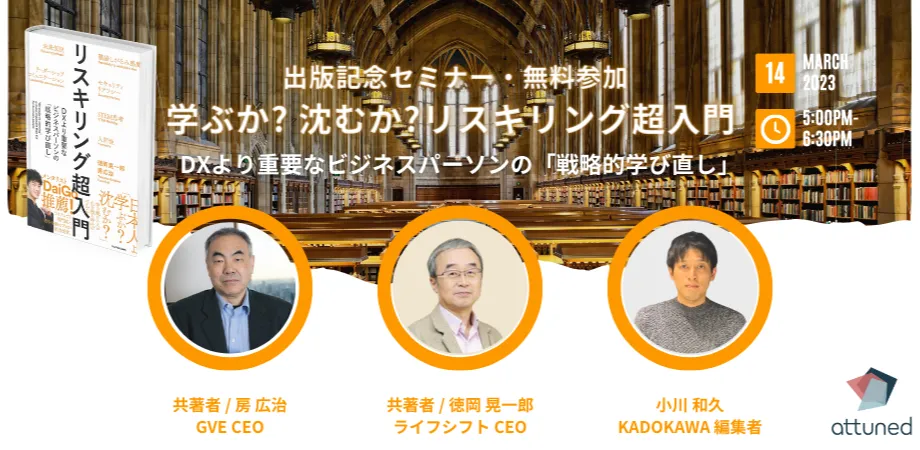 リスキリングという課題に長年取り組んできたライフシフト専門家である徳岡 晃一郎 氏と、国際金融のプロフェッショナルである房 広治 氏が上梓される共著書『リスキリング超入門 DXより重要なビジネスパーソンの「戦略的学び直し」』の出版を記念した公開セミナーを開催いたします! ...