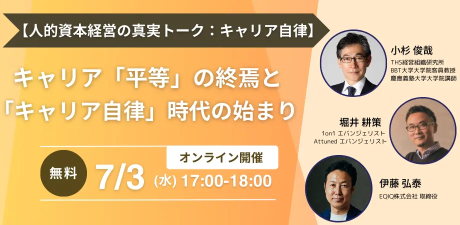 昨今、自己成長の責任が社員個人に求められる一方、自発的な行動も同時に社員に求められるため、「キャリア自律」「リスキリング」等の施策推進には難しさが伴います。 本セミナーでは、人的資本経営とキャリア自律・リスキリングの関係を紐解きつつ、とるべき企業戦略について、小杉俊哉先生と堀井耕策先生と共に本音で語っていきます。「人事は社員を一律に育成」「社員は成長することが前提」「一律の残業削減」など、今日の企...